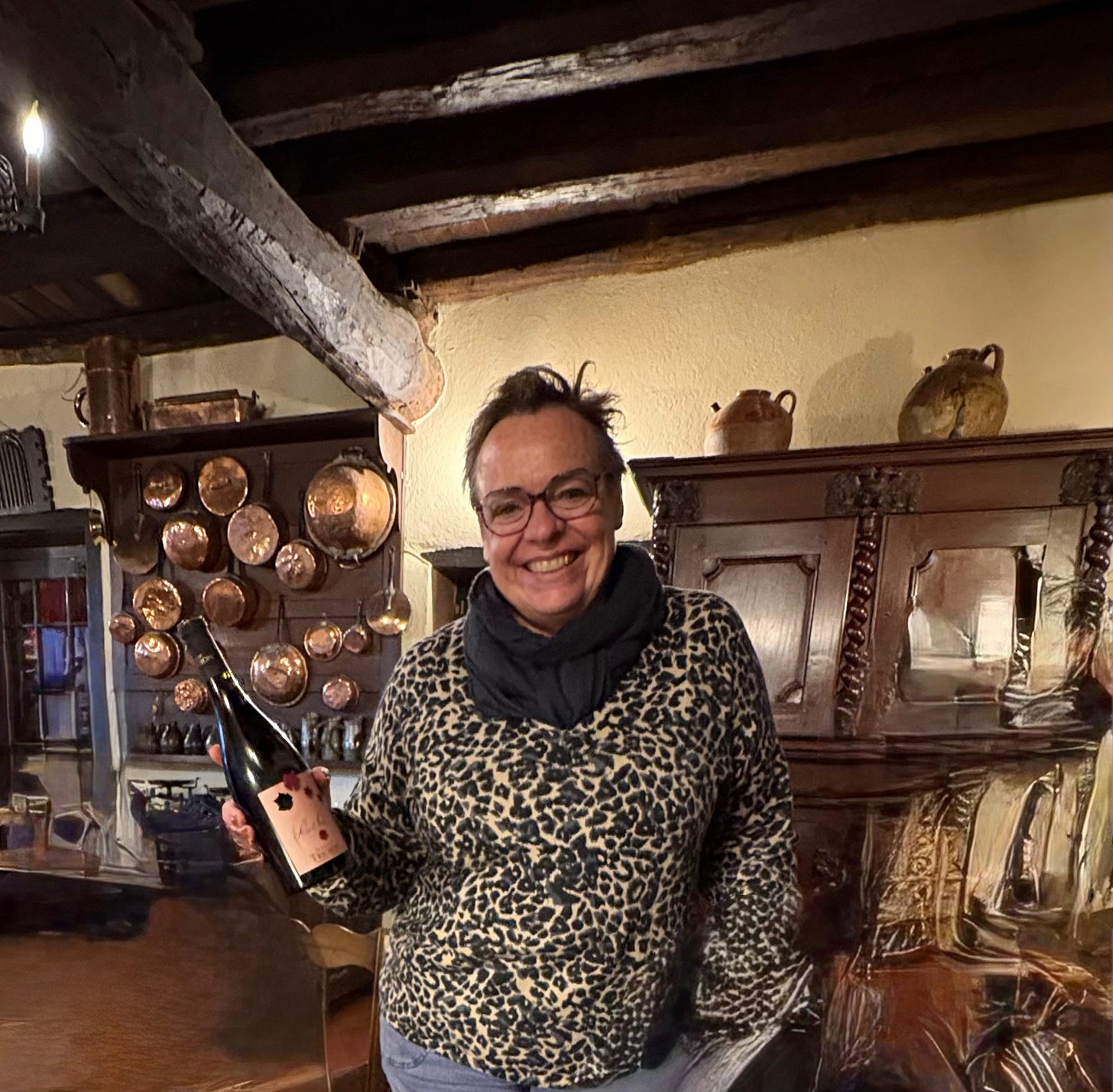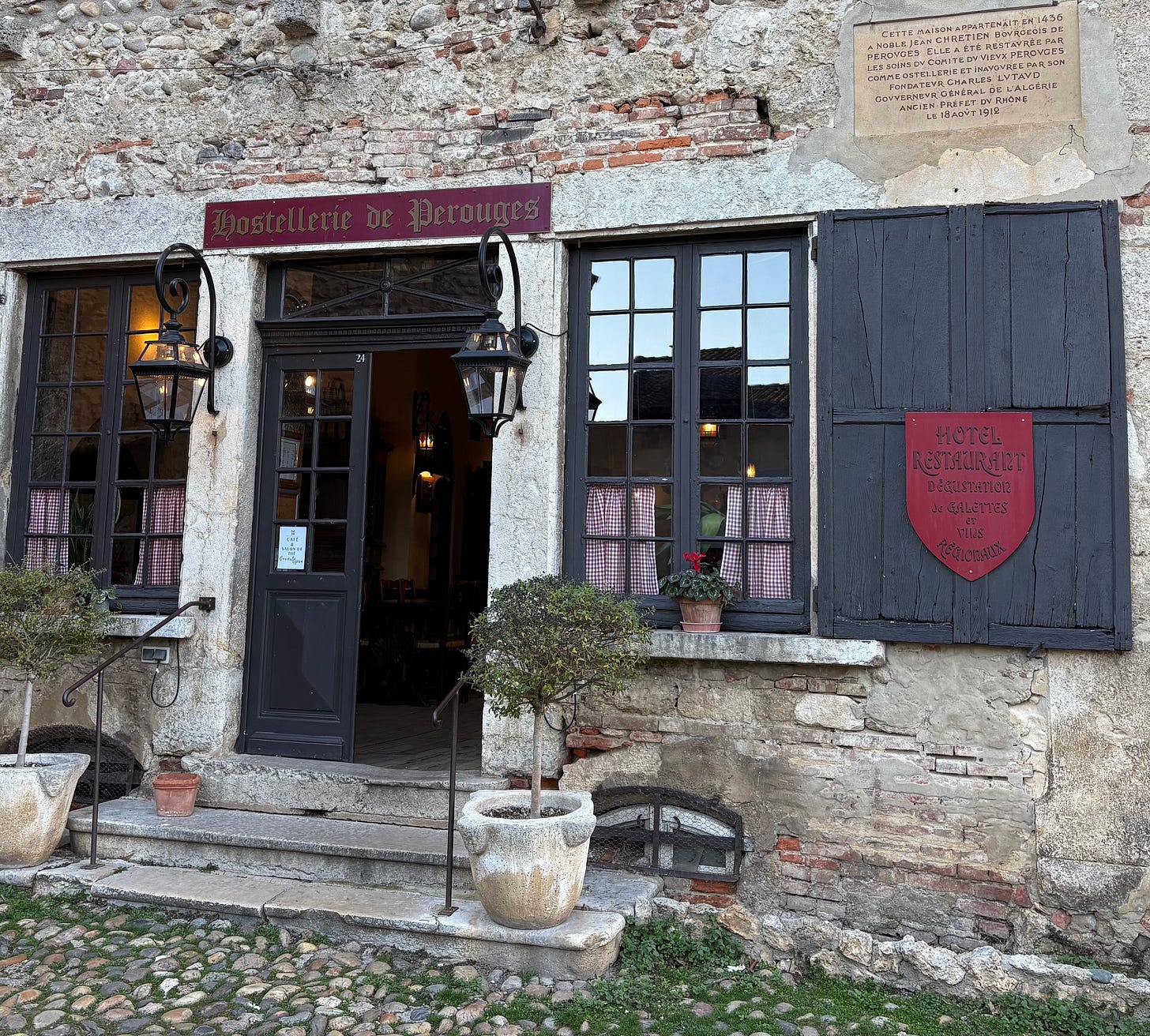 Later that day, on the way back to our rental in Lyon, our guide suggested that we make a stop in the nearby medieval walled village of Perouges. The village dates from the 12th century. A few dozen families sill live there, but it is primarily a living, ongoing historic restoration and popular tourist attraction. It is there that we met the Thibault family, which has owned the Hostellierie de Perouges off the central village square since 1912. Our visit with the Thibaults will most definitely make the highlight reel of our stay in France.